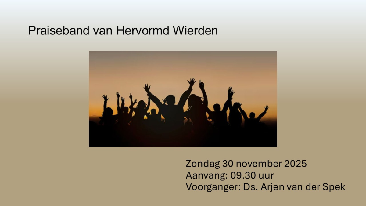 Op zondagochtend 30 november komt de Praiseband van de Hervormde Kerk Wierden onze dienst begeleiden. De dienst begint om 09.30 uur en wordt geleid door ds. Arjen van der Spek.