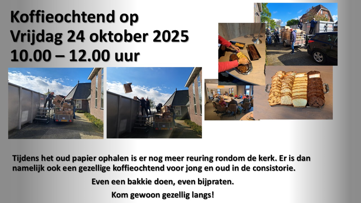 Op vrijdag 24 oktober is er weer een gezellige koffieochtend in de Gereformeerde Kerk. Ook kan het oud papier worden gebracht.