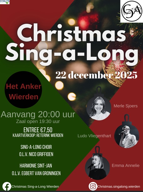 Als je nog in kerstsfeer wilt komen dan is de Christmas Sing -a-Long echt een aanrader. De kaarten zijn vanaf maandag 1 december te koop bij Reterink Boek en Kantoorvakhandel in de Stationsstraat van Wierden a € 7,50. De zaal gaat open om 19.30 uur en de Stouwebloazers heten je al welkom met de klanken van de midwinterhoorn. De avond begint om 20.00 uur.